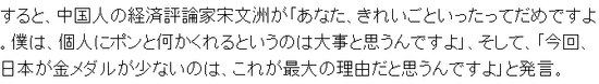 中国的经济评论家宋文洲在节目中发表了自己的观点:“你们(日本)光说漂亮话是没用的,我认为得到奖牌或是其他什么的才最重要。”“这可能这就是日本金牌为数不多的最大原因了。”