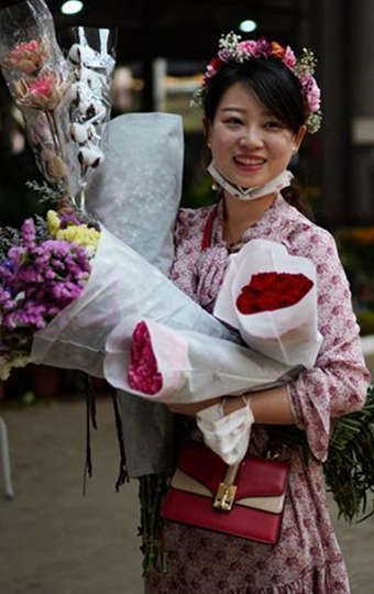 4月6日,游客在昆明斗南花卉市场捧着购买的鲜花拍照。此前,该花卉市场因疫情影响暂停交易,随着疫情缓解,其交易逐渐回暖。中新社记者 康平 摄