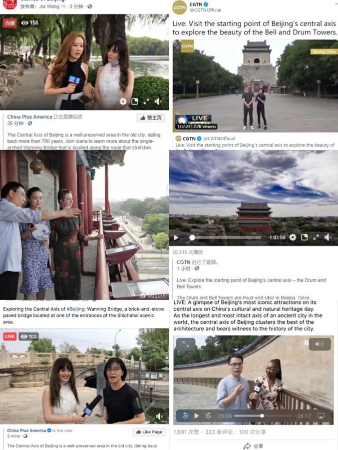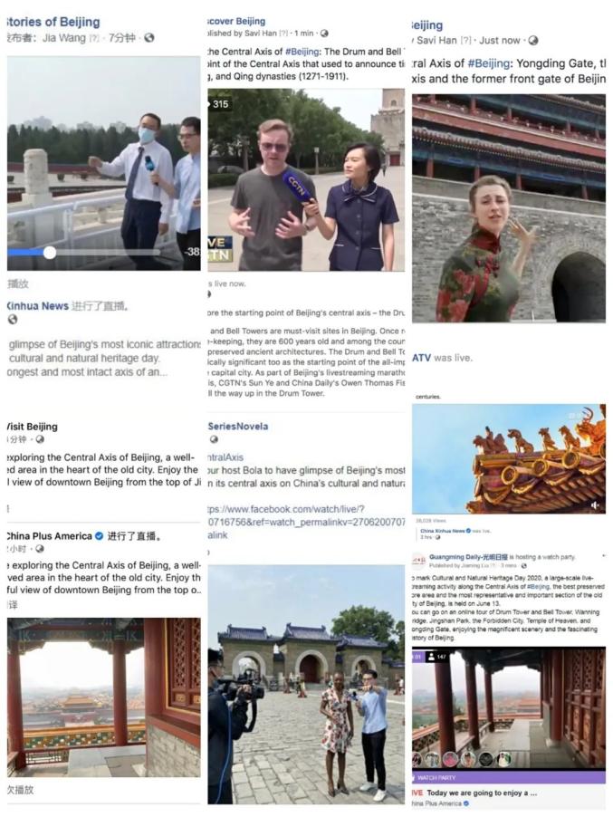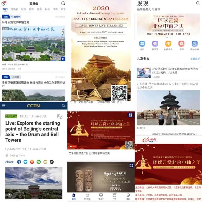 6月13日是中国文化和自然遗产日,北京创新开展了环球云赏北京中轴之美——北京中轴线双百新媒体中英双语全球大直播活动。11时至17时6个小时内,多位文化学者和文物专家担任主播,分别在中轴线沿线的钟鼓楼、万宁桥、景山公园、故宫、天坛、永定门6个代表性点位开展接力直播。“百家政务新媒体账号”和“百家中外新媒体账号”组成传播矩阵,截至活动当天,据不完全统计,本次海内外播出覆盖量已超2.5亿网民。