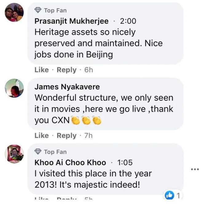 新华社“北京中轴之美”海外直播于新华社官方Facebook、Twitter、YouTube三大海外社交平台播发,5小时获得近10万次点击、近4000次点赞、超500次评论,同时该直播在新华社英文客户端播发。直播在新华社海外社交平台引发强烈反响,网友纷纷表示建筑很美、有历史特点、非常喜欢中国的历史文化。网友“Sita Sundas”评论道:“我去过(天坛),那里历史感十足,有机会还要再去。”网友“James Nyakavere”评论道:“这里的建筑太棒了,之前只在电影里见过,这次居然可以看直播了。”网友“Lily's Love Lily”评论道:“也太壮观了吧!爱了!” “Prasanjit Mukherjee”评论道:“北京的历史文化保护得很好,北京给力。”