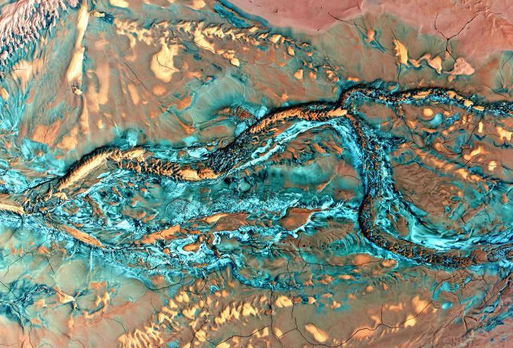 从高空俯瞰辽宁省辽阳市弓长岭区一尾矿池,宛如一幅大地的调色盘,各种颜色的废料被水冲刷形成了斑斓的色彩和奇特的肌理,宛如一幅幅抽象的油画