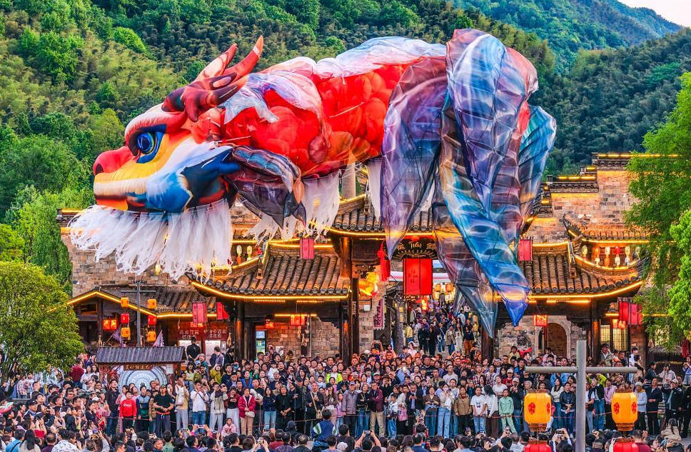 安徽池州市贵池区文旅小镇傩仙镇大型非遗实景演艺《鳌鱼飞天》精彩上演,凭借独特的民俗魅力吸引大批各地游客慕名前来打卡,在山水之间感受非遗魅力与文脉传承