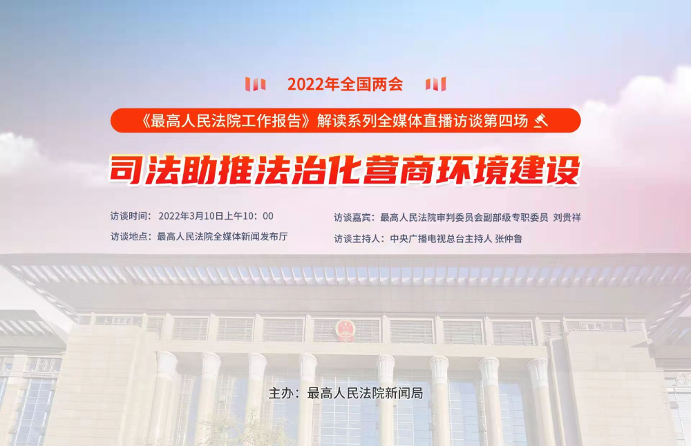 3月10日上午,最高人民法院举办2022年全国两会《最高人民法院工作报告》解读系列全媒体直播访谈第四场活动。最高人民法院审判委员会副部级专职委员刘贵祥就“司法助推法治化营商环境建设”主题与网友在线交流。