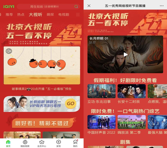 为丰富五一假期网络视听精品内容供给,促进线上视听消费和数字经济发展,持续满足人民群众精神文化需要,4月29日至5月3日,北京市广播电视局组织指导爱奇艺、优酷、抖音、快手、微博、IPTV、歌华有线、搜狐视频、西瓜视频、知乎等10家重点市属网络视听节目服务机构,深耕“北京大视听”品牌,共同打造“北京大视听五一看不停”专区,集中展播优秀视听节目,推出直播演出、线上演唱会、视听交响乐、观影沙龙、话题征集、互动问答、刷片指南等10余场丰富多彩的主题活动。