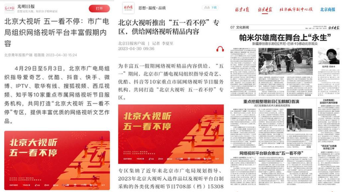 光明日报、北京日报、北京晚报、京报网、网易新闻、今日头条、广电时评、主编温静、影视前哨等重点新闻媒体、资讯网站和公众号对活动进行了报道。“北京大视听五一看不停”相关新闻信息和片单长图通过爱奇艺、优酷、抖音、快手、微博、北京IPTV、知乎等平台传播,浏览量超36万次,取得良好宣传效果。