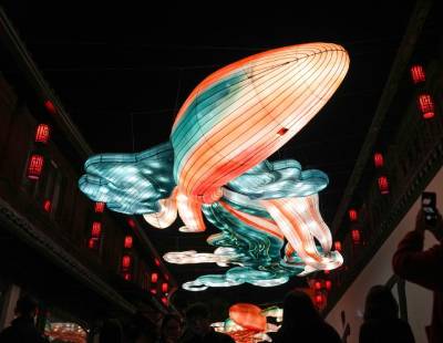 5月10日,天津市武清区,2022“中国非遗年度人物”揭晓仪式结束后,国家级非物质文化遗产代表性项目灯彩(秦淮灯彩)国家级代表性传承人陈柏华正在和参会嘉宾交谈,他已被推选为2022“中国非遗年度人物”。中青报·中青网记者张玉佳/摄