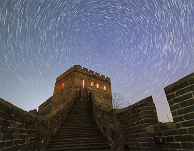 4月10日,浙江省嘉兴市南湖流光溢彩的石桥与壕股塔在夜色中交相辉映。