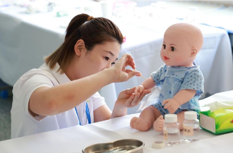 大赛内容紧扣托育服务一线实际。在保育员和育婴员赛道,比赛涵盖生活照料、卫生保健与急救处理、综合技能展示三大模块,全面检验选手在日常照护、教育沟通、游戏设计和应急处置等方面的能力。例如,在模拟幼儿突发情绪问题的场景中,选手们通过科学的沟通与安抚技巧化解难题,充分体现了保教融合的专业理念。