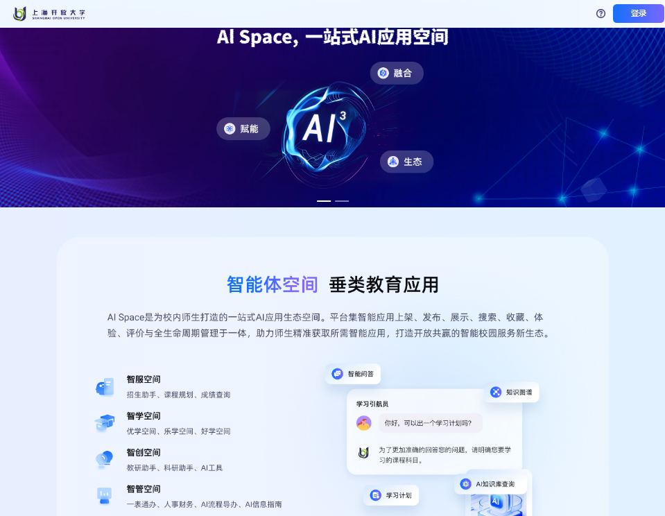 上海开放大学AI应用空间,面向全校师生开放试运行,该平台以“AI赋能×AI融合×AI生态”为核心理念,深度融合人工智能技术,打造集学习、实践、创新、管理于一体的智慧教育新平台,2025年度拟将推出100个以上的智能体,为开放教育注入全新活力。