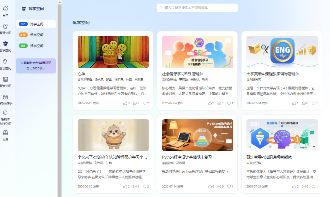 在智学空间中,60余个由我校教师亲手打造的课程智能体全新入驻,覆盖人文与公共管理学院、经管学院、理工学院、民生学院、马院等学院的特色课程。“心伴”心理辅导、“小忆来了”老年照护、“Python程序设计”“设计助教达达”“智能财务助教”“家庭收纳”等智能体,为学习者提供课程导学、知识点答疑、复习自测等个性化支持。
