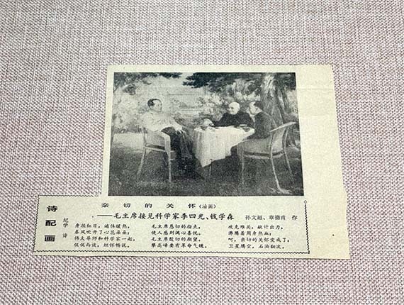 这张剪报上绘制的油画《亲切的关怀——毛主席接见科学家李四光、钱学森》记录了1964年2月6日下午毛主席邀请李四光、钱学森等科学家到中南海畅谈科学工作的事情。当时的艺术家根据这一事件创作了油画,钱学森将刊载此画的报纸做成剪报收藏。