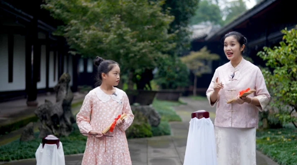 “赖汤圆、叶儿粑,咚咚隆咚一炮三响,龙抄手、钟水饺,还有素面大王……”这么多成都名小吃,可不是成都版的《报菜名》,而是配合左手檀板、右手击鼓的节拍,唱出来的清音唱词。近日,“蜀戏新韵”成都市2025年度戏曲进校园戏曲慕课——四川清音上线。成都市非物质文化遗产保护中心曲艺团青年演员宋玲娟和小小传承人郑曾带来了四川清音经典曲目《川菜飘香》和《赶花会》。