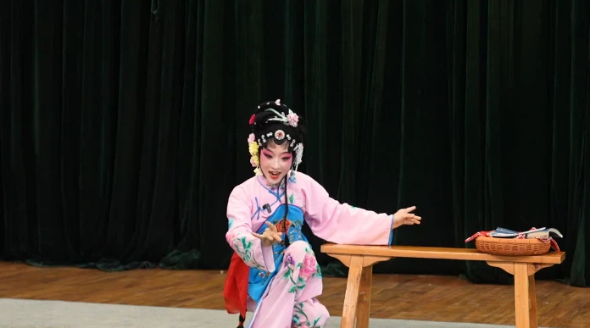 在展演过程中,周海琴传授了剧中的“诀窍”:“孙玉姣是少女,‘端篮上场’时身形越灵动,脚步越轻盈越好。‘穿针引线’这个动作,要右手如捏针,左手如持线,眯眼、对准、穿线一气呵成。再说‘喂鸡’,从数鸡、找鸡等细节,要配合灵巧眼、惊诧眼、幽怨眼、转眼等不同眼神。如果别人看不懂你在做什么,就说明表演不到位。艺术升华的根基是用心演戏,用‘技’传‘情’。”