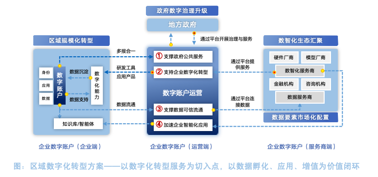 在政府引领下建设区域转型公共服务平台与综合服务平台,以企业数字账户贯通企业、服务商与政府,实现政务治理升级、服务生态集聚与区域数据流通。某区基于此方案已支持500+企业接入并获得高质量服务,形成可复制的区域样板。