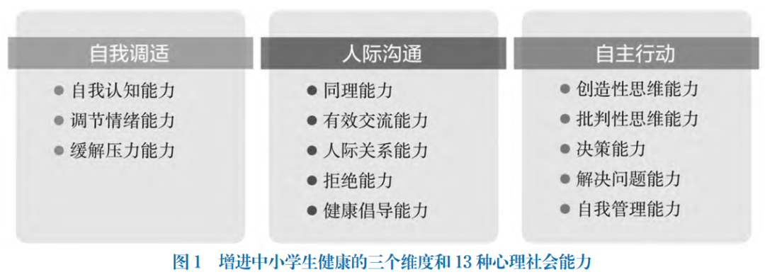 1. 学生教科书发展学生思维、提升核心素养的特点。教材在总结既往教材编写经验和成果的基础上,创新教材内容、编排和呈现方式,加强教材的情境性和实践性。为提升学生的思维能力,培养学生的核心素养和学以致用的能力,学生教科书主要从3个方面进行了创新性的设计和规划:(1)在研究和梳理国际上通用的健康教育生活技能的基础上,总结和提炼了13项增进中小学生健康的心理社会能力(见图1),用以指导教科书编写,打造传递知识和发展能力并重的教科书。而基于发展心理社会能力的健康教育教学也能更有效地增进学生的终身健康,促进学生核心素养的发展。(2)构建了基于真实情境和促进学以致用的课文体例结构。为新编学生教科书编写有结构化的四环节,即“基于现实问题情境激趣导入—基于活动初步认知概念—基于信息联结解决问题—基于知识技能的运用与迁移拓展”。这有利于开展深度学习,将教学从单纯的知识传授转变为基于知识、技能和方法的素养培育。(3)以鲜活有趣的栏目和活动设计拓展知识、深化思维和促进运用。教材中多样、丰富的栏目,穿插在每课内容中和课后,启发学生学思结合、学用结合。小学阶段主要有《健康小博士》《运动小达人》《互动角》《生活小能手》等栏目,初中阶段主要有《知识链接》《互动交流》《探究思考》《实践运用》等栏目,符合学生的认知特点。