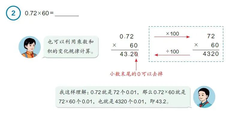 (2)分步推进对乘除法一致性的理解。乘除法运算的一致性较为抽象,学生不易理解,故在初学整数、小数、分数乘除法时,新教材不展开对一致性的研究,而是着重结合运算意义,引导学生在探索算理算法的过程中逐步感悟计数单位在运算中的作用。例如,对于多位数乘一位数的学习,新教材通过有色字体突出对计数单位的运算,增加将多位数拆成计数单位和计数单位个数的乘积之和的形式,用多个分步的横式完整表达计算过程,呈现用计数单位描述算理的过程(如图1)。又如,教学小数乘法时,新教材注重呈现用计数单位个数的运算来解释算理的过程,感悟小数乘法运算中的一致性(如图2)。在完成整数、小数和分数的乘除法学习后,新教材在六年级的总复习阶段进行关联,让学生认识到整数、小数和分数的乘除法运算所具有的内在一致性:计数单位与计数单位相乘(除)得到新的计数单位,计数单位上的数字与计数单位上的数字相乘(除)得到新的计数单位的个数。其意在让学生进一步体会,在计数单位这一核心概念统辖下,整数、小数和分数运算在原理上、数学形式上是一脉相承的,从而提升学生对四则运算的理解水平。