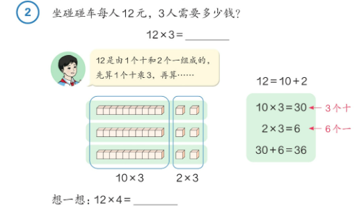(1)层次递进的教学活动设计。新教材遵循“由易到难、循序渐进”的原则,设计阶梯式的教学活动。以多位数乘一位数的笔算教学为例,其内容编排按照“不进位→一次进位→连续进位”的认知梯度展开:先建立乘法竖式的基本概念,再解决一次进位的问题,最后突破连续进位的难点。这种逐层递进的编排方式符合学生的认知规律,有助于学生深入理解算理。