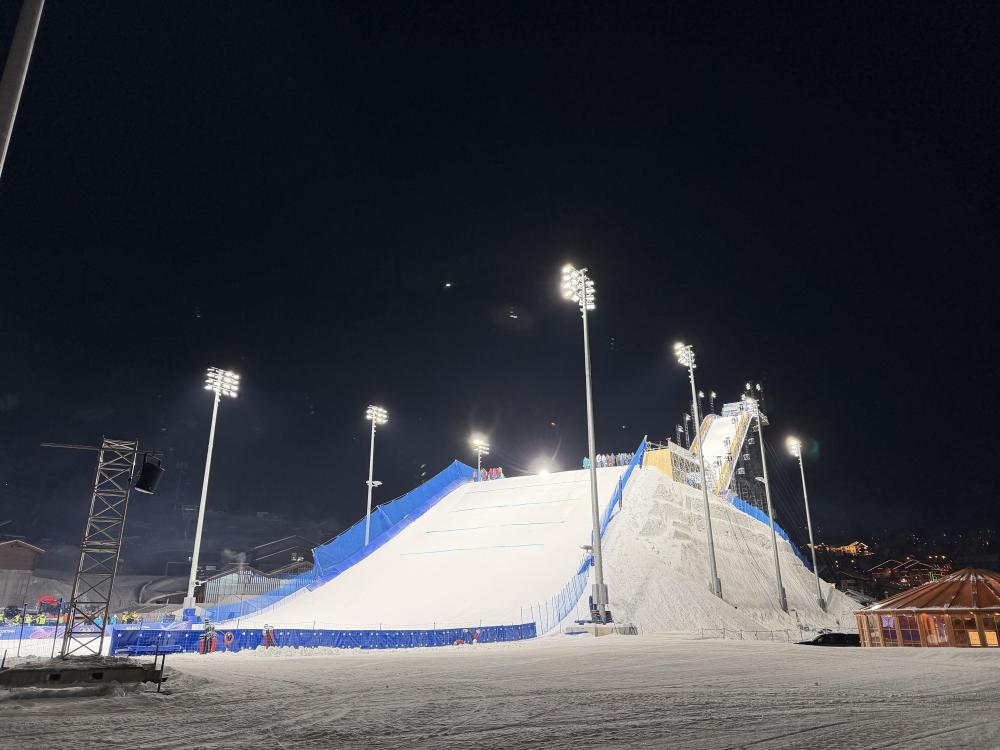 2日晚的利维尼奥飘起雪花,滑雪公园灯火通明。热火朝天的场景,透着“争分夺秒”的气息。一侧,大跳台选手高高跃起,与雪花一同在空中旋转;另一侧山坡上的坡面障碍技巧、U型场地技巧和障碍追逐场地,压雪车引擎轰鸣,扬起的雪片与落下的雪花在空中交汇。