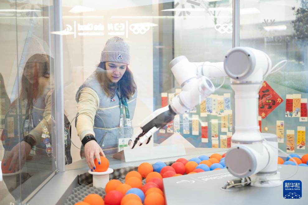 2月3日,在意大利米兰奥运村,法国冰球队运动员在赞助商阿里云展台体验智能徽章交换。