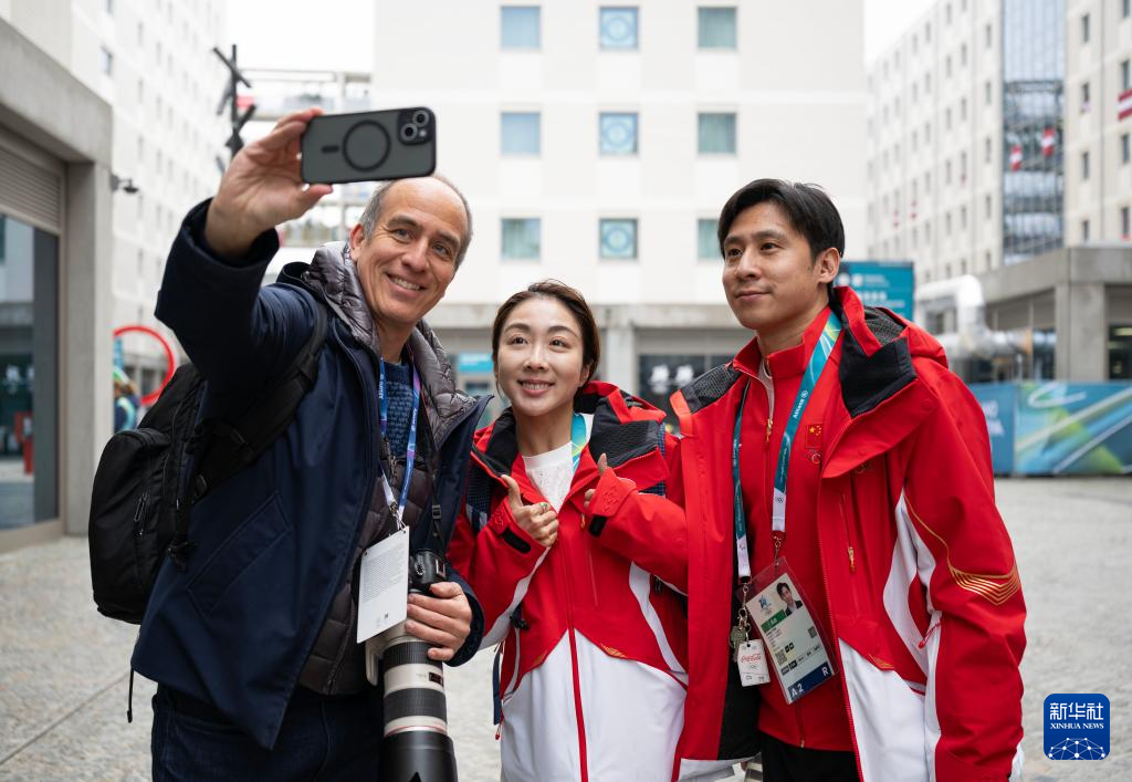 2月3日,在意大利米兰奥运村,一名记者与中国花滑队运动员隋文静(中)、韩聪(右)自拍留念。