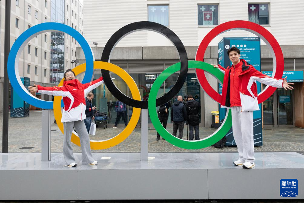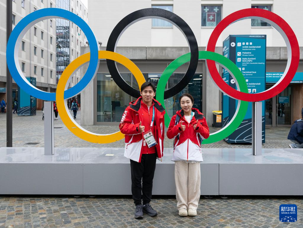 2月3日,在意大利米兰奥运村,中国花滑队运动员王诗玥(左)、柳鑫宇与奥运五环合影。