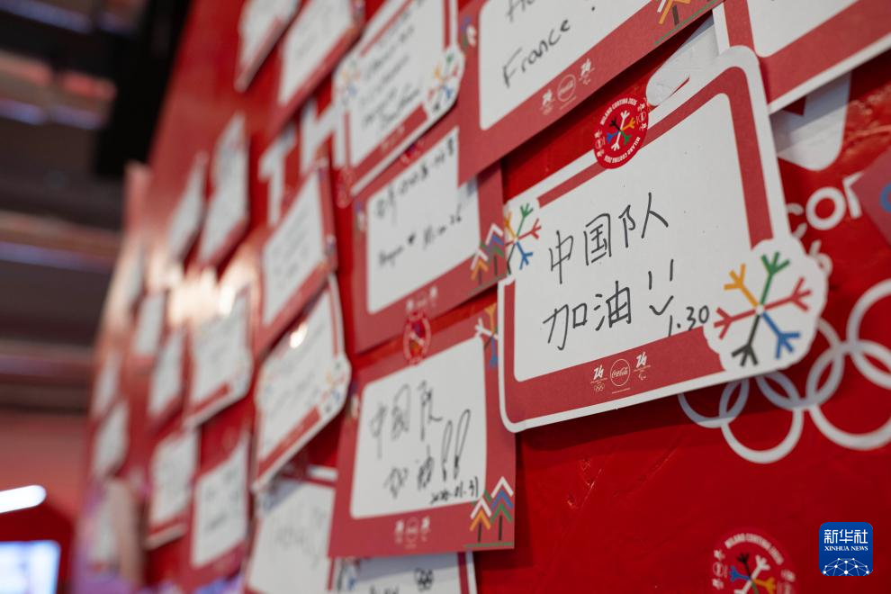 这是2月3日在意大利米兰奥运村拍摄的“中国队加油”祝福贴纸。