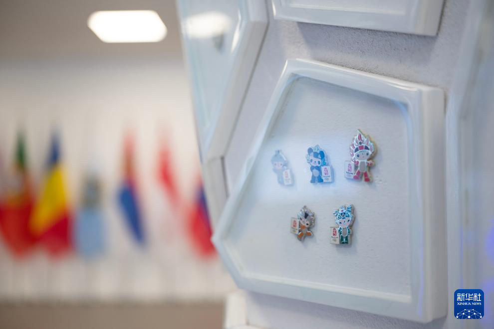 这是2月3日在意大利米兰奥运村拍摄的北京冬奥会徽章。