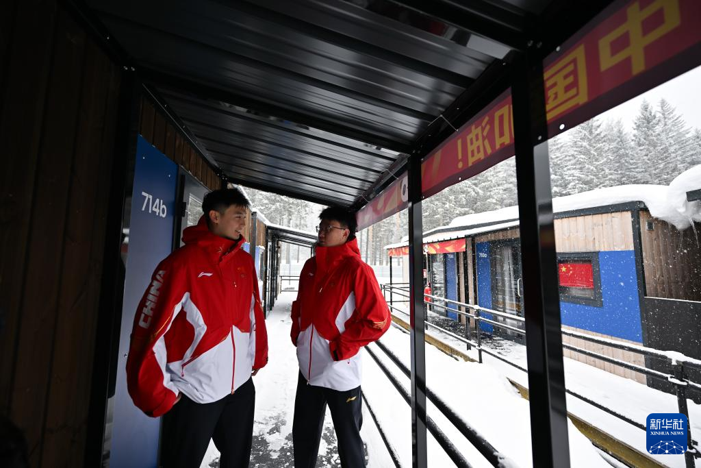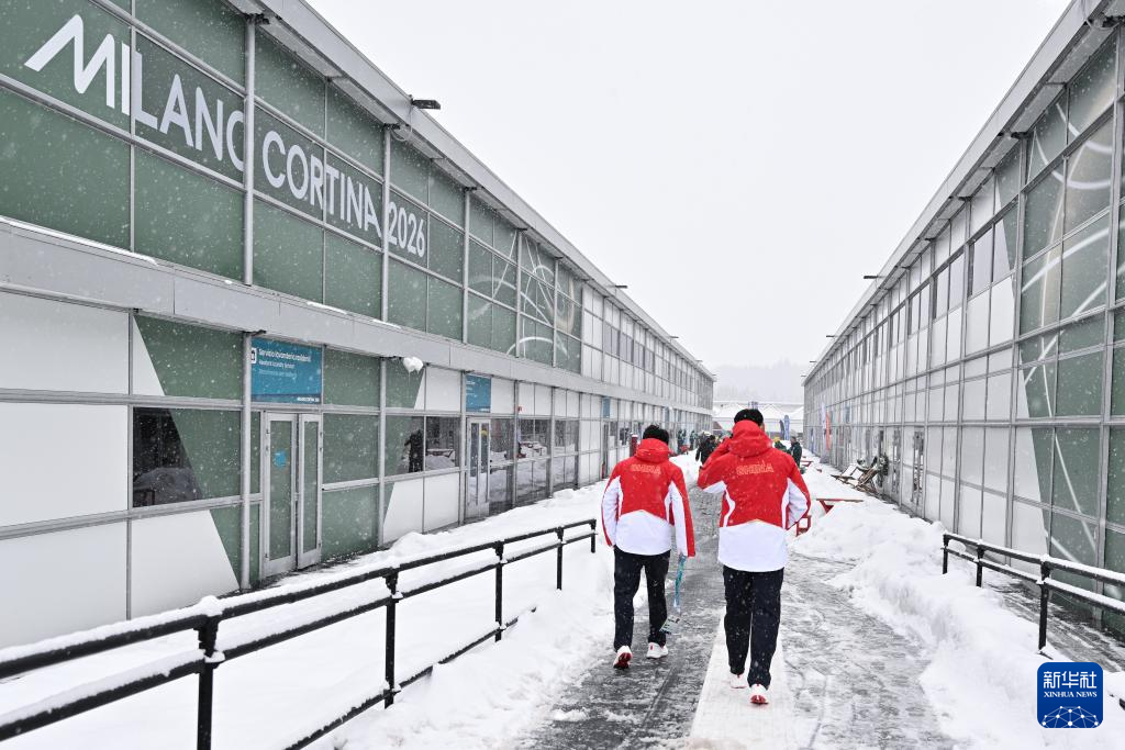 2月3日,中国体育代表团成员走在科尔蒂纳丹佩佐奥运村里。