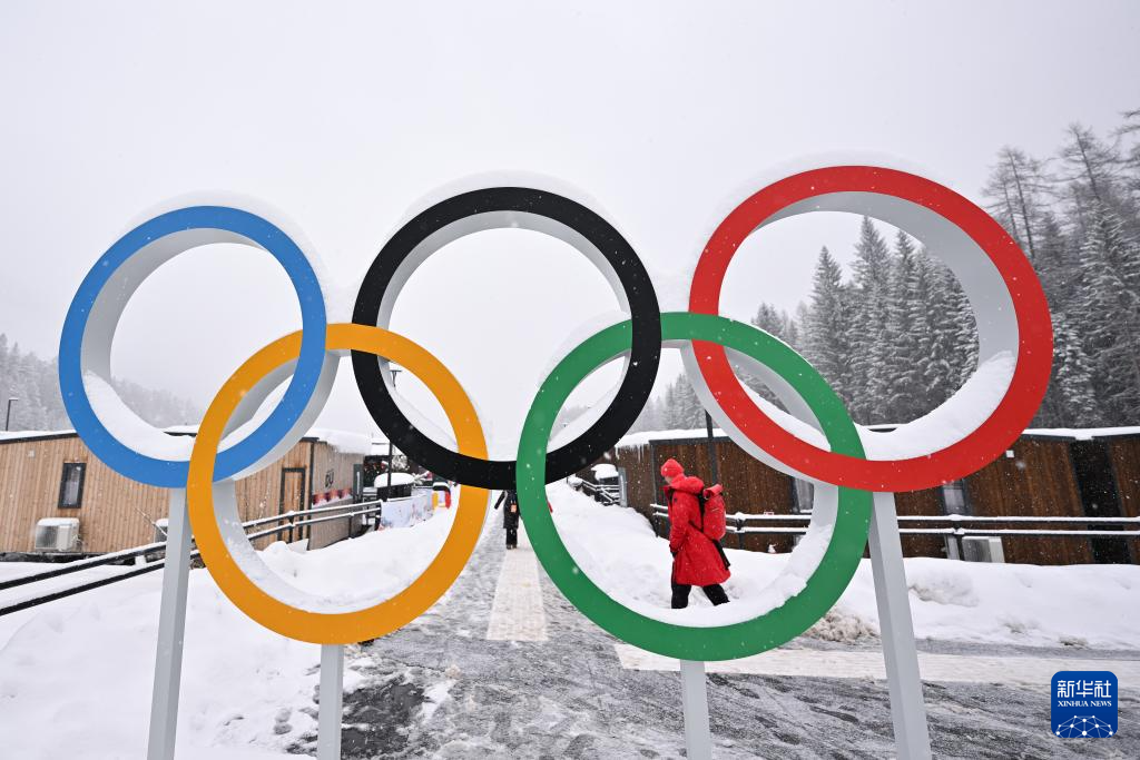 这是2月3日在科尔蒂纳丹佩佐奥运村拍摄的奥运五环标志。