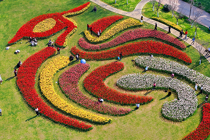 江苏连云港花果山下大圣湖畔樱花烂漫,粉白相间、景致如画。