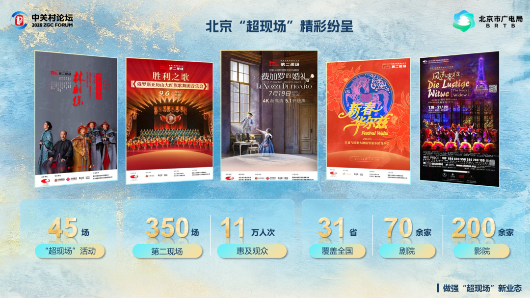 北京市广电局联合相关单位打造的“超现场” 作为文化科技融合的创新成果,正以惊人的速度改变着传统演出的传播格局。数据显示,目前“超现场”已覆盖全国 31个省(自治区、直辖市)及中国香港、中国澳门,还有马来西亚等地的70余家 剧院,200余家影院,第二现场演出超350场次,惠及 11万余人次。从世界经典歌剧《费加罗的婚礼》、俄罗斯亚历山大红旗歌舞团 “胜利之歌”音乐会,到轻歌剧《风流寡妇》及“新春华尔兹”音乐会,“超现场”正通过数字视听技术助力传统实体演出,生动诠释“一地演出、千里共赏、万人共鸣”的传播效果,让不同地域的观众能够同步沉浸在精彩的演出之中,共享文化盛宴。