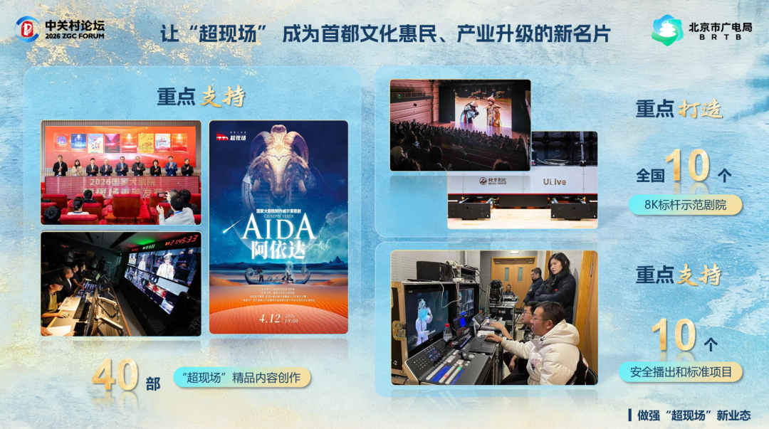 2026年,北京市广电局联合市经济和信息化局制定《北京市关于加快培育“超现场”产业生态的若干措施》,拟支持 40部“超现场”精品内容创作和10个安全播出与标准项目,打造全国10个8K标杆示范剧院,布局辐射全国、贯通城乡的 100家终端影剧院组网体系。内容、终端、标准齐头并进,开创“超现场”业态和首都文化产业繁荣发展的新局面,让文化惠民深入人心。