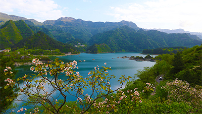 重庆市黔江区小南海国家地质公园内油桐花盛开,花朵掩映着堰塞湖、公路、民居与山峦,勾勒出一幅秀美的春日生态画卷。