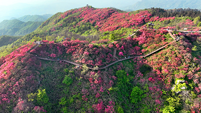 安徽金寨县太平山上映山红盛开,漫山红遍,吸引游客前来赏花踏青、乐享春光。