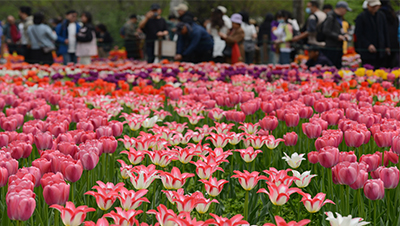 国家植物园(北园)郁金香已全面进入最佳观赏期,100余个品种、20余万株郁金香竞相绽放,吸引大批市民游客周末前往赏花打卡。