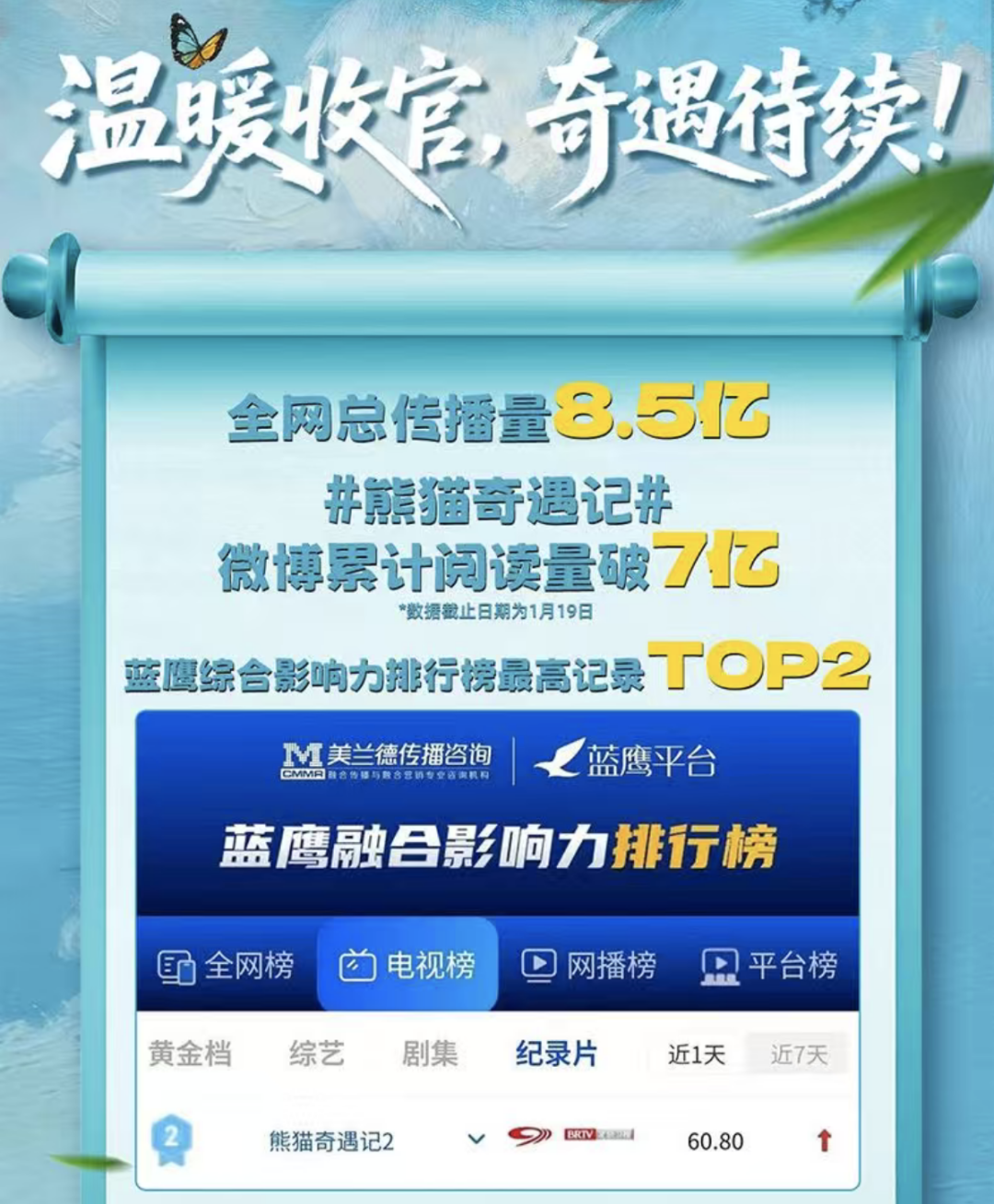 《熊猫奇遇记》第二季自开播以来,以全网总曝光量超8.5亿的亮眼成绩,实现了一场从荧屏到社交平台、从视觉到心灵的全方位“生态奇遇”。微博主话题#熊猫奇遇记阅读量突破 5.4亿,衍生话题累计超7亿;抖音、快手平台70余条精品短视频播放量超 1.5亿次。电视端同样表现强劲,北京卫视CSM35城收视达1.284%,稳居周末黄金档前列。
