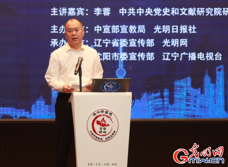 由中宣部宣教局、光明日报社共同主办,辽宁省委宣传部、光明网承办的“核心价值观百场讲坛”第158场活动,中共中央党史和文献研究院研究员李蓉,作题为《中流砥柱——抗日战争中的中国共产党》的主题演讲。图为辽宁省委宣传部副部长焦万伟为活动致辞。(张嘉琪/摄)