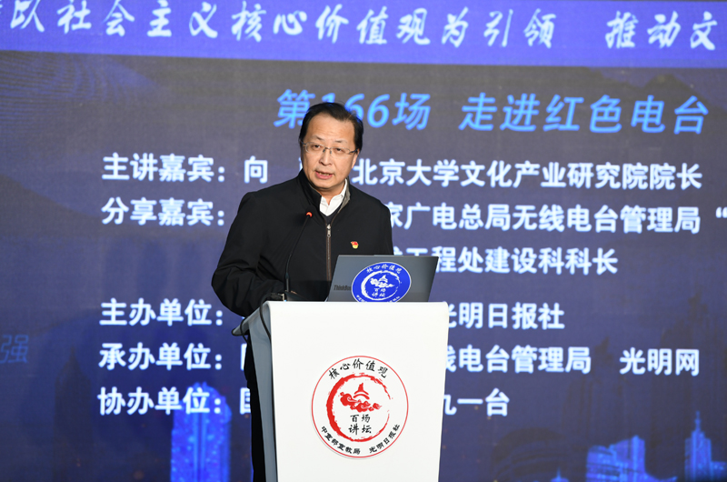 1月5日,由中宣部宣教局、光明日报社共同主办,国家广电总局无线电台管理局、光明网承办,国家广电总局四九一台协办的“核心价值观百场讲坛”第166场活动,邀请北京大学文化产业研究院院长向勇发表题为《坚持以社会主义核心价值观为引领,推动文化与科技融合发展》的主题演讲。国家广电总局无线电台管理局“十大杰出青年”、技术工程处建设科科长刘浩东同步进行主题分享。图为本场活动主持人光明日报社副总编辑邢宇皓。(光明网记者潘迪/摄)