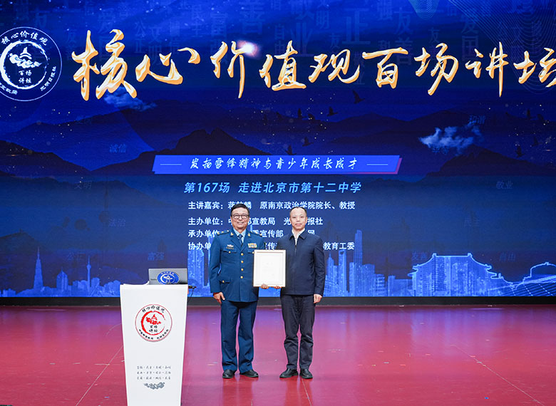 3月20日,由中宣部宣教局、光明日报社共同主办,北京市委宣传部、光明网承办,丰台区委宣传部、丰台区委教育工委协办的“核心价值观百场讲坛”第167场活动,邀请原南京政治学院院长、教授蒋乾麟,作题为《雷锋精神与成长成才》的主题演讲。图为中宣部宣教局副局长曾建立为主讲嘉宾颁发聘书。(光明网记者赵金悦/摄)