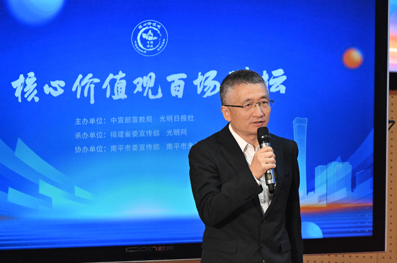 3月27日,由中宣部宣教局、光明日报社共同主办,福建省委宣传部、光明网承办,南平市委宣传部、南平市朱子文化传承发展中心协办的“核心价值观百场讲坛”第168场活动,邀请华东师范大学终身教授、中华朱子学会常务副会长朱杰人作主题演讲。南平市朱子文化传承发展中心副研究员吴吉民同步进行主题分享。图为本场活动主持人光明网总裁、总编辑杨谷。(闽北日报社摄影记者罗光耀/摄)