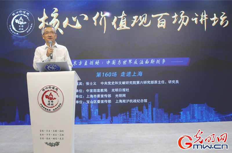 由中宣部宣教局、光明日报社共同主办,上海市委宣传部、光明网承办,宝山区委宣传部、上海淞沪抗战纪念馆协办的“核心价值观百场讲坛”第160场活动,邀请中央党史和文献研究院第六研究部原主任、研究员张士义,作题为《东方主战场:中国与世界反法西斯战争》的主题演讲。
