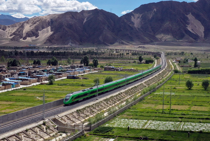 复兴号动车组列车驶过山南市扎囊县扎其乡德吉新村。西藏日报记者 白玛泽旺摄