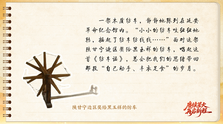 一架木质纺车,静静地陈列在延安革命纪念馆内。“小小的纺车吱纽纽地转,摇起了纺车纺线线……”面对这架陕甘宁边区奖给黑玉祥的纺车,唱起这首《纺车谣》,总会把我们的思绪带回那段“自己动手、丰衣足食”的岁月。