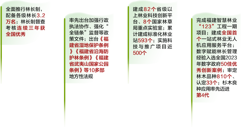 福建省林业系统以“山海”为卷,以“绿林”为笔,在“十四五”的壮阔征程中奋力书写“绿富同兴”的时代答卷。回望奋斗路,福建林业人持续深化集体林权制度改革,以生动实践接续作答林改“四问”,推动林业改革向纵深迈进、绿色本底不断厚植、生态屏障日益巩固、产业富民动能强劲、支撑体系持续夯实,一幅林业高质量发展的生动画卷正在八闽大地徐徐展开。