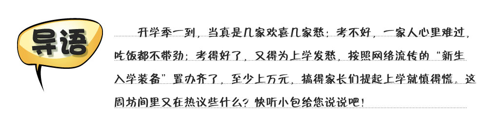 | 开学消费别成“开学浪费” 入学应提倡轻装上阵 | | 新学期开学,新一轮的学生装备采购又开始了,“开学经济”迅速升温。记者在浙江省衢州市区市场上发现,除了传统文具外,一些如复读机、学习机、电子辞典等数码文具产品的销售也异常火爆。对于这些高档“文具”的热销,有老师表示,这类文具并非学习必需品,不当消费会使孩子产生互相攀比和奢侈浪费的不良习惯。 高档文具成消费热点 卡通卷笔刀28元一个,多功能铅笔盒95元一个,而造型图案各异的书包最贵的竟高达600多元…… 数码升级 学子跟风 除了传统的文具、书等文化用品,近年一些数码产品也加入到了“开学装备”的行列之中。 开学消费要正确引导 从名牌书包、文具,到高档自行车,再到数千元的手机、笔记本电脑,面对火爆的“开学经济”,也有教育人士对此表示担忧。详细>> 【给大学新生的十三条建议】 【开学季消费“网购化”趋势明显】 【专家支招消除新学期忧虑】 |